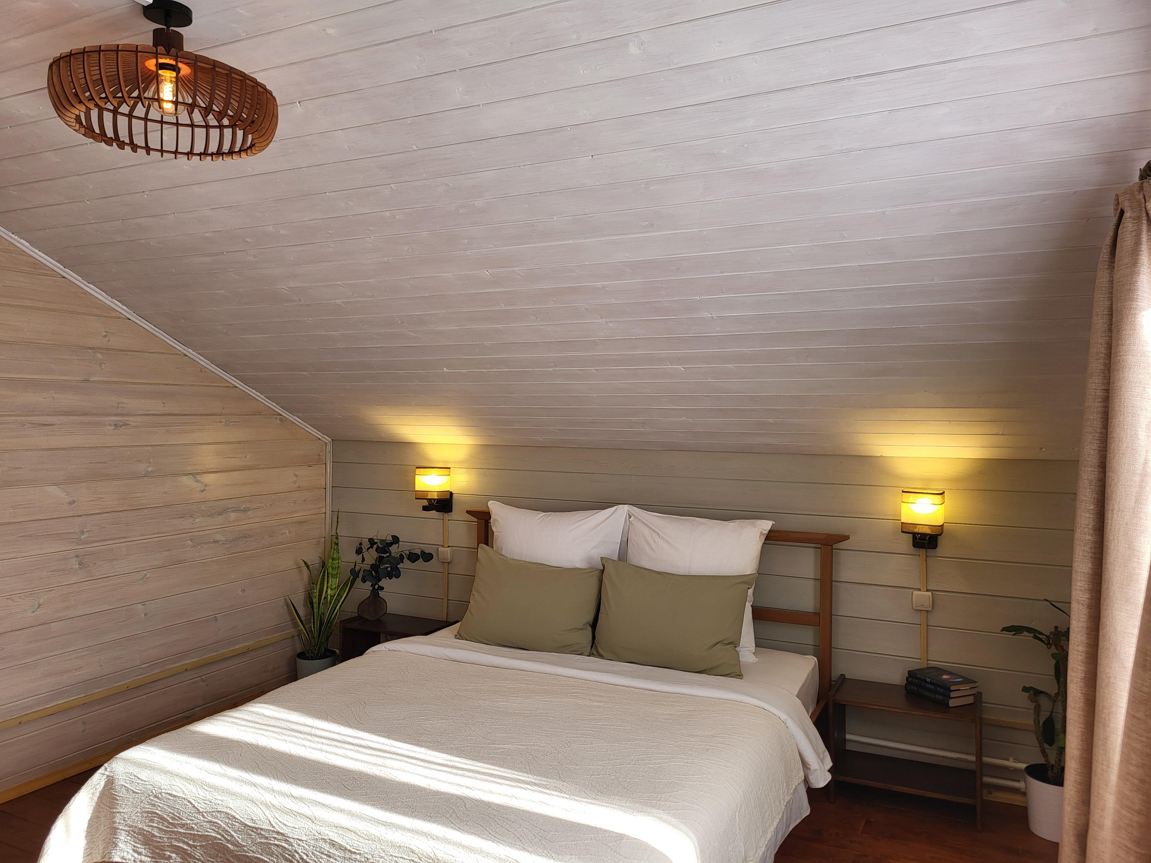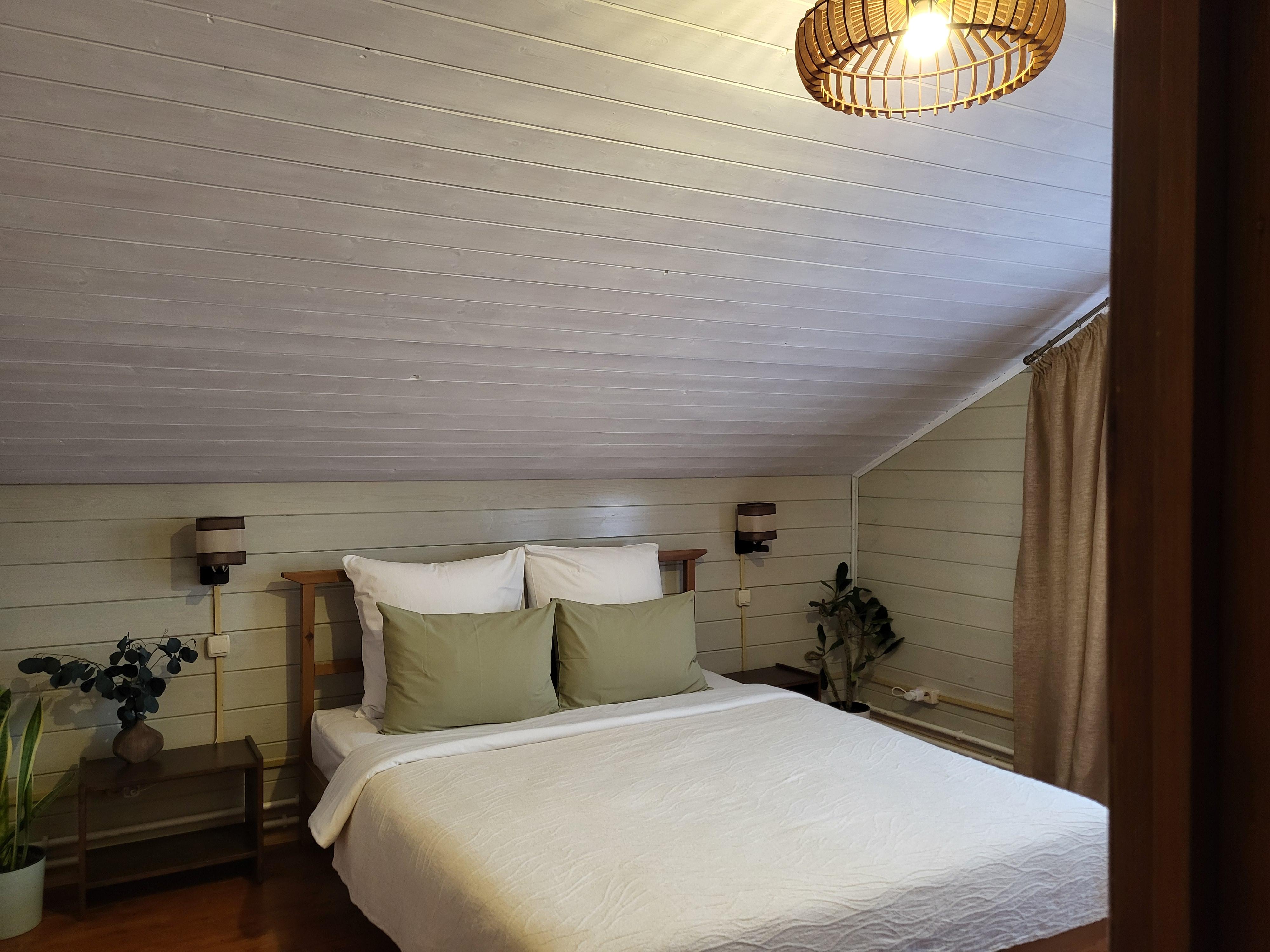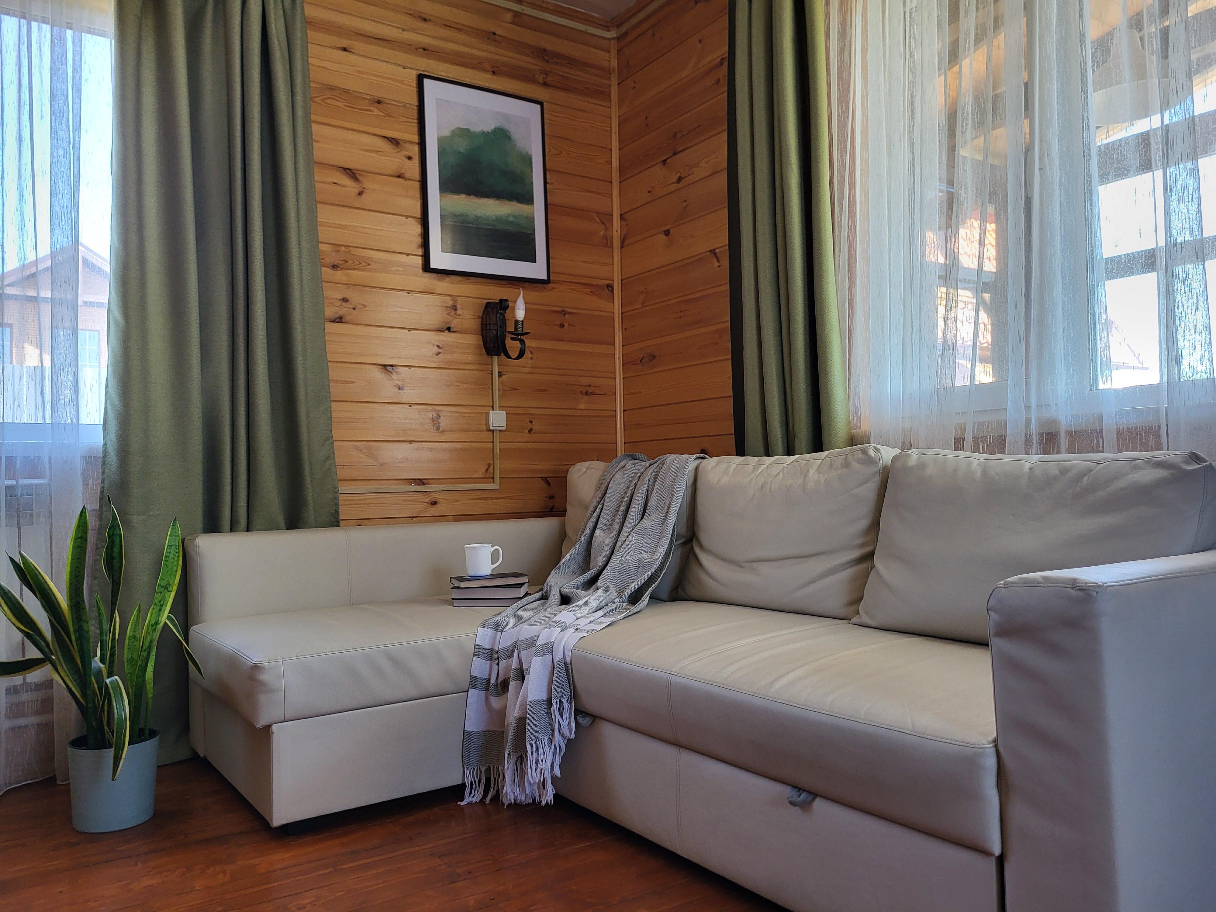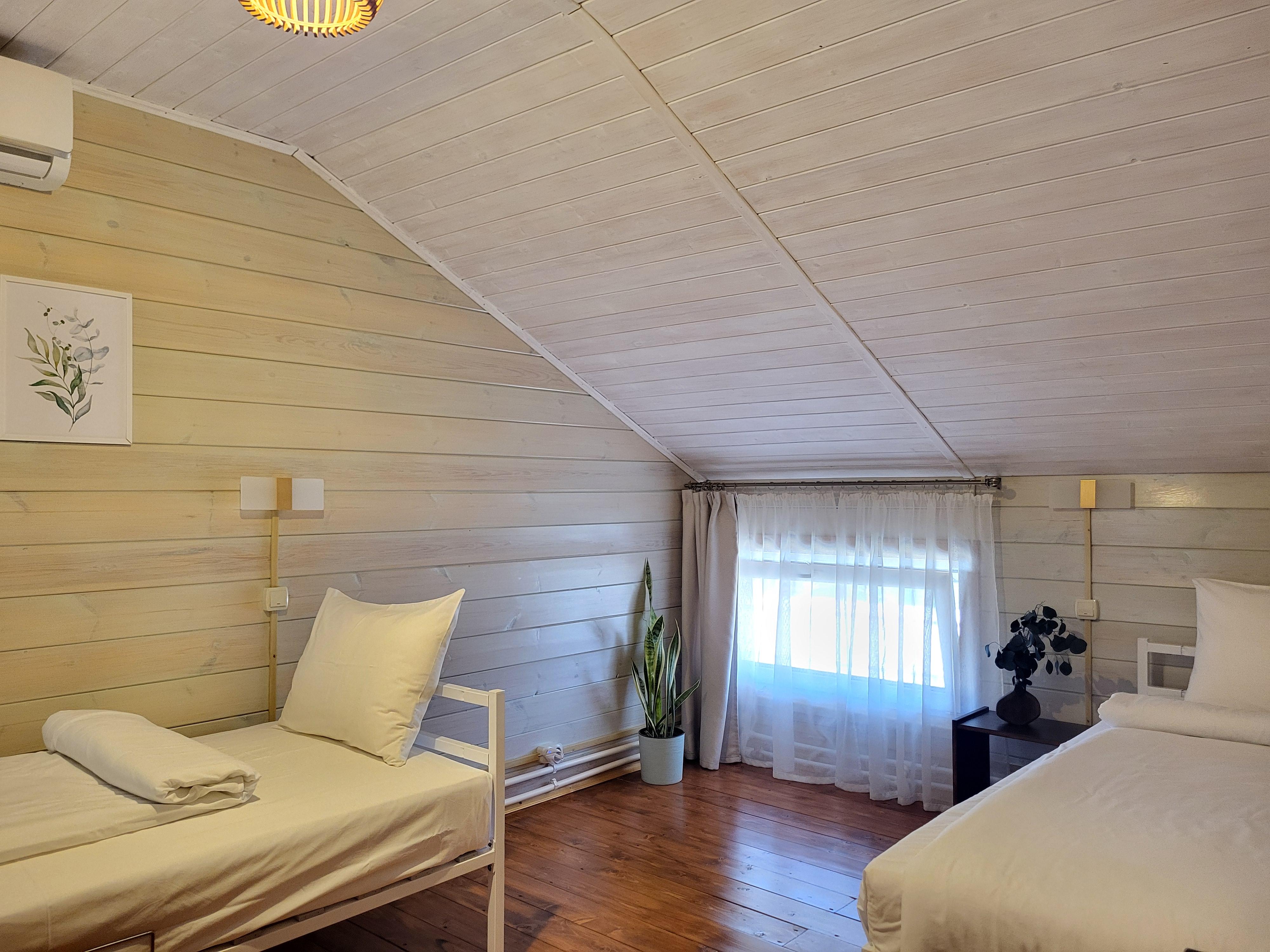 Количество спален -2 Количество гостей-5 Дополнительные места-2 Площадь 90 кв.м Цена зависит от сезона и дней недели. Подробнее в календаре Двухэтажный коттедж имеет собственную парковку для 2 авто, застекленную террасу с мебелью, мангальную зону. На первом этаже находится кухня-гостиная, сауна, душевая и санузел. На втором этаже 2 спальни с двуспальной кроватью и тремя односпальными. В гостиной можно разложить диван в двуспальное место. По предварительному запросу для детей до 3-х лет бесплатно предоставляем детскую кроватку-манеж. Дом укомплектован всеми необходимыми удобствами для комфортного проживания. У нас белоснежное постельное белье и полотенца высокого качества. Пользование сауной бесплатно и не ограничено по времени. Помещение парной растапливается дровами за 40-50 минут. Приветственная вязанка дров в подарок. Запрещено: • использование банных веников • проведение шумных вечеринок и мероприятий • курение во всех помещениях дома • проживание незаявленных при бронировании гостей Мы не оказываем гостиничные услуги, только временное размещение.